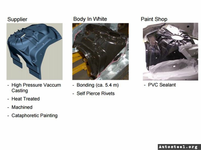 - Aluminum shock tower is applied on steel body with using sealant and structural rivets